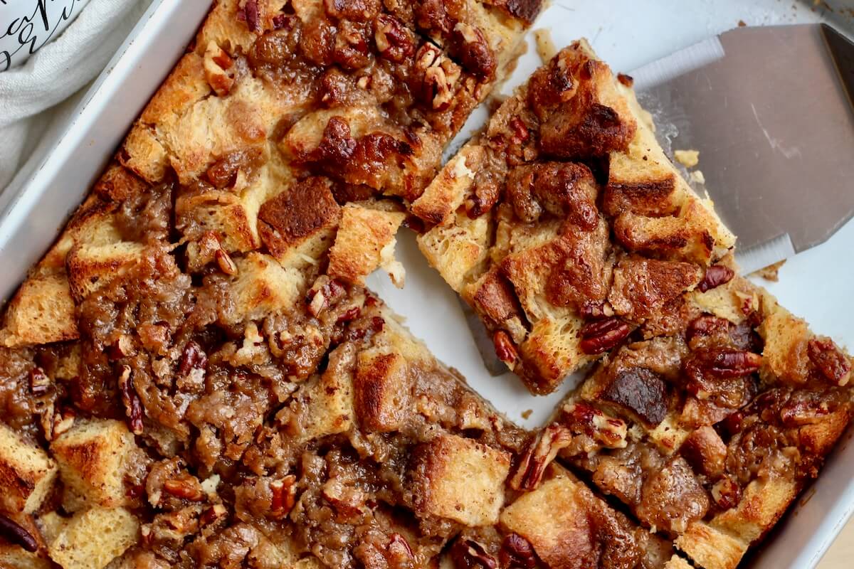 - In a large mixing bowl, whisk together the eggs, milk, granulated sugar, vanilla, cinnamon, nutmeg, and salt until well combined. Pour the custard evenly over the bread, pressing down gently with the back of a spoon to help the bread soak up the liquid. Sprinkle the pecan topping evenly over the casserole.6 large eggs, 2 cups whole milk, ¼ cup granulated sugar, 2 teaspoons vanilla extract, 1 teaspoon ground cinnamon, ¼ teaspoon ground nutmeg, ¼ teaspoon Diamond Crystal Kosher Salt