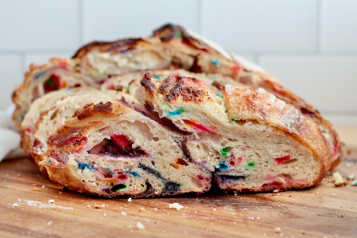 Store funfetti sourdough bread (whole or sliced) in a bread box or airtight container at room temperature for up to 2 days.