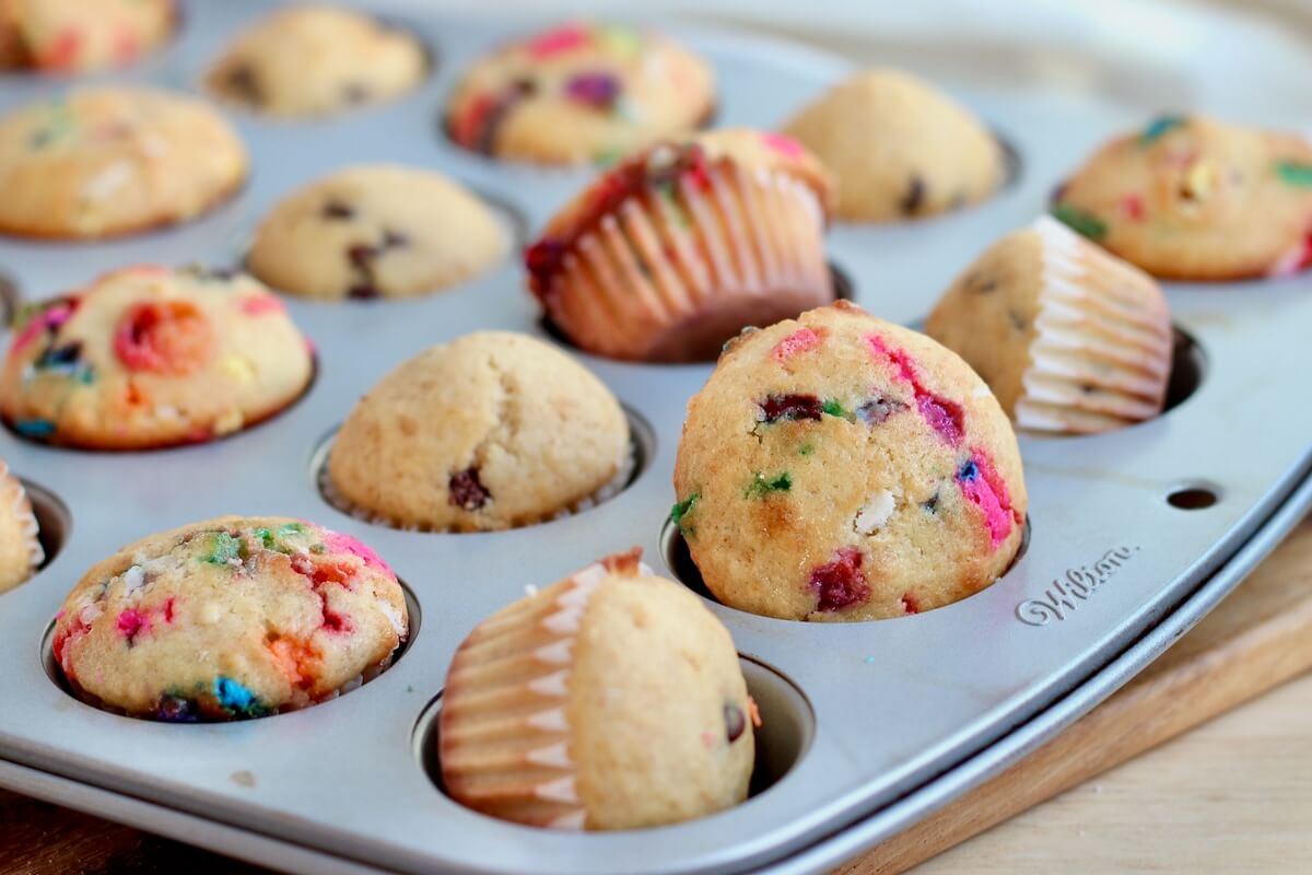 - Spoon the batter into the muffin cups, filling each about ¾ full. You’ll make about 48 mini muffins, so you may need to bake in two batches. Bake for 12–14 minutes, or until golden and a toothpick inserted in the center comes out clean.